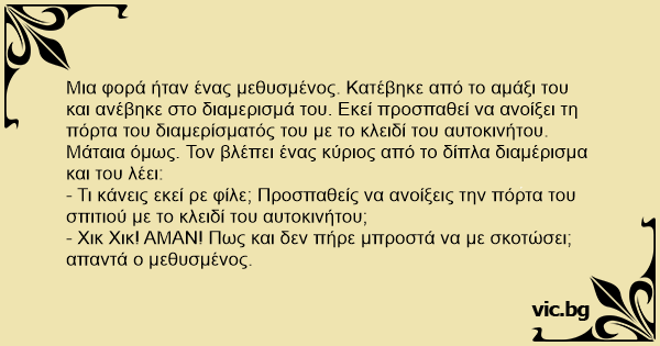 Μια φορά ήταν ένας μεθυσμένος. Κατέβηκε από το αμάξι του και ανέβηκε στο διαμερισμά του. Εκεί προσπαθεί να ανοίξει τη πόρτα του διαμερίσματός του με το κλειδί του αυτοκινήτου.