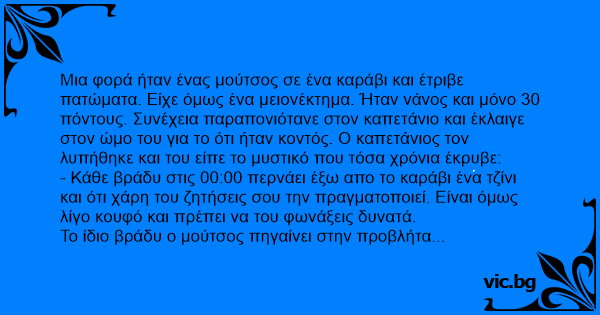 Μια φορά ήταν ένας μούτσος σε ένα καράβι και έτριβε πατώματα. Είχε όμως ένα μειονέκτημα. Ήταν νάνος και μόνο 30 πόντους. Συνέχεια παραπονιότανε στον καπετάνιο και έκλαιγε στον ώμο του για το ότι ήταν κοντός. Ο καπετάνιος τον λυπήθηκε και του είπε το μυστικό που τόσα χρόνια έκρυβε: