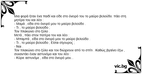 Μια φορά ήταν ένα παιδί και είδε στο όνειρό του το μαύρο βελούδο. πάει στη μητέρα του και λέει :