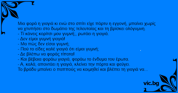 Μια φορά η γιαγιά κι ενώ στο σπίτι είχε πάρτυ η εγγονή, μπαίνει χωρίς να χτυπήσει στο δωμάτιο της τελευταίας και τη βρίσκει ολόγυμνη.