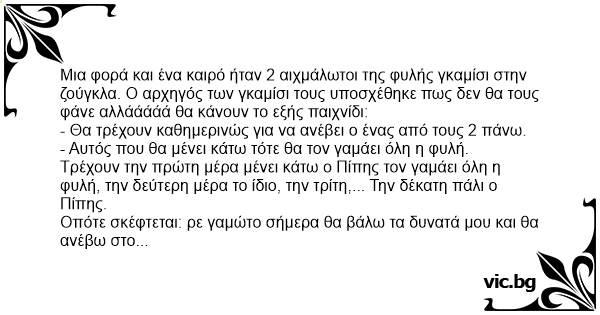 - Σταθείτε αδέλφια, ακούστε τι θα γίνει: Βαρέθηκα να γαμάμε τον κάτω ας γαμήσουμε και μια φορά τον πάνω.