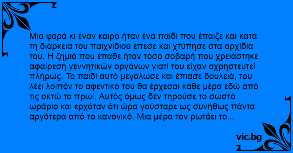 Μια φορά κι έναν καιρό ήταν ένα παιδί που έπαιζε και κατά τη διάρκεια του παιχνιδιού έπεσε και χτύπησε στα αρχίδια του. Η ζημιά που έπαθε ήταν τόσο σοβαρή που χρειάστηκε αφαίρεση γεννητικών οργάνων γιατί του είχαν αχρηστευτεί πλήρως. Το παιδί αυτό μεγάλωσε και έπιασε δουλειά, του λέει λοιπόν το αφεντικό του θα έρχεσαι κάθε μέρα εδώ από τις οκτώ το πρωί. Αυτός όμως δεν τηρούσε το σωστό ωράριο και ερχόταν ότι ώρα γούσταρε ως συνήθως πάντα αργότερα από το κανονικό. Μια μέρα τον ρωτάει το αφεντικό του γιατί δεν είσαι συνεπείς στην ώρα σου και εκείνος του απαντάει κύριε όλοι οι συνάδελφοι που έρχονται στην ώρα τους δεν πιάνουν δουλειά αμέσως, συνήθως όλοι ξεκινούν την ώρα που έρχομαι εγώ και ώσπου να ξεκινήσουν δεν κάνουν τίποτα μόνο ξύνουν τα αμελέτητά τους εγώ που δεν έχω τι να ξύσω...