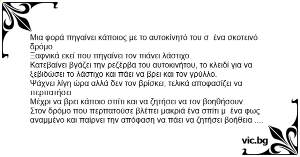 Στον δρόμο που περπατούσε βλέπει μακριά ένα σπίτι μ ένα φως αναμμένο και παίρνει την απόφαση να πάει να ζητήσει βοήθεια . Καθώς περπατούσε σκεπτόταν διάφορα πράγματα ,δεν ήξερε αν είχαν αυτοκίνητο και αν είχαν αυτοκίνητο αν θα είχαν γρύλλο, μήπως τον παρεξηγούσαν, μήπως ήταν καμιά γυναίκα μόνη της και φοβόταν και τον πυροβολούσε και πολλά άλλα, όλα αρνητικά. Φτάνοντας λοιπόν στο σπίτι απογοητευμένος από της αρνητικές σκέψεις παίρνει την απόφαση να χτυπήσει την πόρτα. Χτυπά την πόρτα και περιμένει να του ανοίξουν. Ανοίγει λοιπόν η πόρτα, βγαίνει κάποιος κύριος και πριν προλάβει να μιλήσει του λέει ο άλλος..