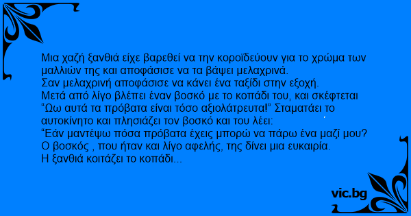 Πριν φύγει, ο βοσκός την πλησιάζει και της λέει “Εάν μαντέψω το πραγματικό χρώμα των μαλλιών σου, μπορώ να πάρω τον σκύλο μου πίσω?”