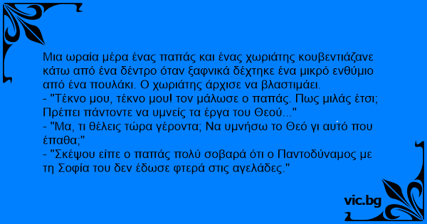 Μια ηλιόλουστη μέρα στο καφενεδάκι ενός μικρού χωριού συζητούσε ένας χωρικός με τον παπά του χωριού. Έξαφνα ένα πουλί που πετούσε αυτή την στιγμή από πάνω τους κάνει μια κουτσουλιά και πέφτει πάνω...