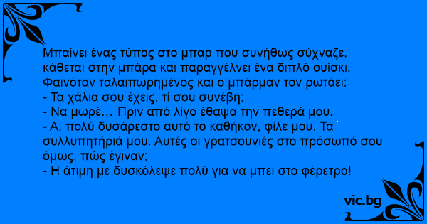 Μπαίνει ένας τύπος στο μπαρ που συνήθως σύχναζε, κάθεται στην μπάρα και παραγγέλνει ένα διπλό ουίσκι. Φαινόταν ταλαιπωρημένος και ο μπάρμαν τον ρωτάει: