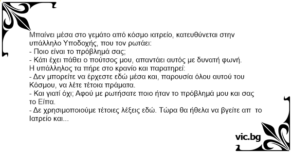 Μπαίνει μέσα στο γεμάτο από κόσμο ιατρείο, κατευθύνεται στην υπάλληλο Υποδοχής, που τον ρωτάει: