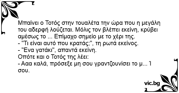 Μπαίνει ο Τοτός στην τουαλέτα την ώρα που η μεγάλη του αδερφή λούζεται. Μόλις τον βλέπει εκείνη, κρύβει αμέσως το ... Επίμαχο σημείο με το χέρι της.