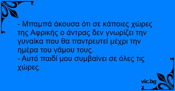 Синот го прашува таткото: Вистина ли е дека во некои области на Африка мажот не ја познава жената сè додека не ја ожени? Таткото: Така ти е тоа, сине мој, во сите земји.
