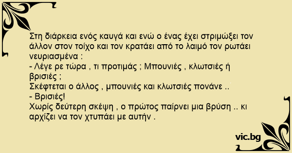 Στη διάρκεια ενός καυγά και ενώ ο ένας έχει στριμώξει τον άλλον στον τοίχο και τον κρατάει από το λαιμό τον ρωτάει νευριασμένα :
