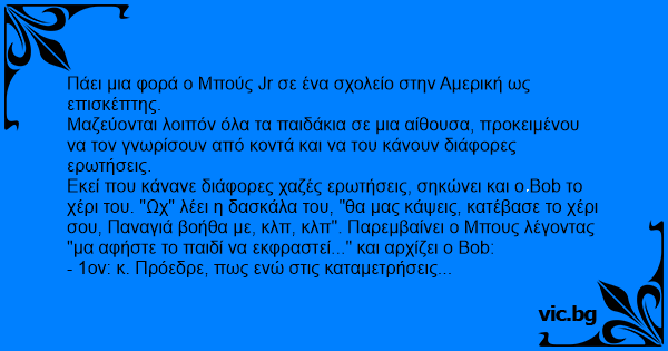 Εκεί που κάνανε διάφορες χαζές ερωτήσεις, σηκώνει και ο Bob το χέρι του. "Ωχ" λέει η δασκάλα του, "θα μας κάψεις, κατέβασε το χέρι σου, Παναγιά βοήθα με, κλπ, κλπ". Παρεμβαίνει ο Μπους λέγοντας "μα αφήστε το παιδί να εκφραστεί..." και αρχίζει ο Bob: