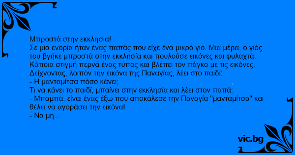 Σε μια ενορία ήταν ένας παπάς που είχε ένα μικρό γιο. Μια μέρα, ο γιός του βγήκε μπροστά στην εκκλησία και πουλούσε εικόνες και φυλαχτά. Κάποια στιγμή περνά ένας τύπος και βλέπει τον πάγκο με τις εικόνες. Δείχνοντας, λοιπόν την εικόνα της Παναγίας, λέει στο παιδί: