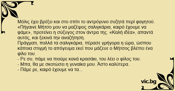 Μόλις έχει βρέξει και στο σπίτι το αντρόγυνο συζητά περί φαγητού. «Πήγαινε Μήτσο μου να μαζέψεις σαλιγκάρια, καιρό έχουμε να φάμε», προτείνει η σύζυγος στον άντρα της. «Καλή ιδέα», απαντά αυτός, και ξεκινά την αναζήτηση.