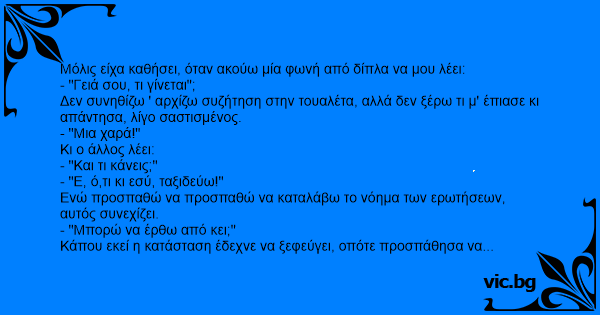 - "Κοίτα, θα πρέπει να σε κλείσω. Είναι ένας μ@λάκας στη διπλανή τουαλέτα που απαντά συνεχώς στις ερωτήσεις μου!"