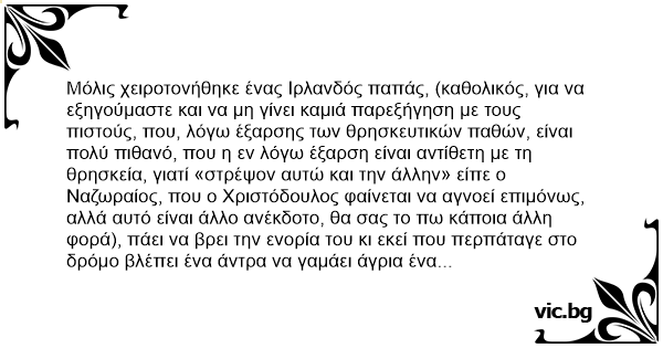 Μόλις χειροτονήθηκε ένας Ιρλανδός παπάς, (καθολικός, για να εξηγούμαστε και να μη γίνει καμιά παρεξήγηση με τους πιστούς, που, λόγω έξαρσης των θρησκευτικών παθών, είναι πολύ πιθανό, που η εν λόγω έξαρση είναι αντίθετη με τη θρησκεία, γιατί «στρέψον αυτώ και την άλλην» είπε ο Ναζωραίος, που ο Χριστόδουλος φαίνεται να αγνοεί επιμόνως, αλλά αυτό είναι άλλο ανέκδοτο, θα σας το πω κάποια άλλη φορά), πάει να βρει την ενορία του κι εκεί που περπάταγε στο δρόμο βλέπει ένα άντρα να γαμάει άγρια ένα πρόβατο. Είπε κάνα-δυο προσευχές, για την άφεση των αμαρτιών του αμαρτωλού, σταυροκοπήθηκε σαν καλός καθολικός, (το ξανατονίζω: ΚΑΘΟΛΙΚΟΣ) και προχώρησε. Παρακάτω στο δρόμο, βλέπει έναν άλλον άντρα να γαμάει μανιωδώς ένα άλλο πρόβατο, (δεν ήτανε το ίδιο, γιατί «από πρόβατα, υπάρχουνε, γυναίκες πού θα βρούμε;») Ξανά προσευχές για άφεση αμαρτιών, σταυροκόπημα κλπ και προχώρησε. Στην είσοδο της πόλης είδε έναν άλλο άντρα να μαλακίζεται δημοσία και με... ενθουσιασμό! Τότε ακριβώς ήταν που αποφάσισε για το τι θέμα θα είχε το πρώτο του κήρυγμα προς τους πιστούς της ενορίας του. Την Κυριακή λοιπόν, ανεβαίνει στον άμβωνα και λέει: