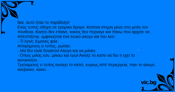Τρελαμενος ο τυπος ανοιγει το καπό, κυριως από περιεργεια, παει το αλογο, ανεβαινει, κανει κατι περιεργα με τις οπλες και του λεει: