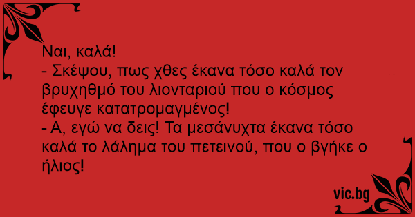 - Α, εγώ να δεις! Τα μεσάνυχτα έκανα τόσο καλά το λάλημα του πετεινού, που ο βγήκε ο ήλιος!