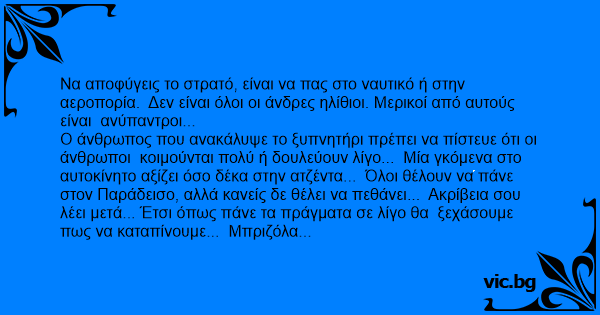 O άνθρωπος που ανακάλυψε το ξυπνητήρι πρέπει να πίστευε ότι οι άνθρωποι κοιμούνται πολύ ή δουλεύουν λίγο... Μία γκόμενα στο αυτοκίνητο αξίζει όσο δέκα στην ατζέντα... Όλοι θέλουν να πάνε στον Παράδεισο, αλλά κανείς δε θέλει να πεθάνει... Ακρίβεια σου λέει μετά... Έτσι όπως πάνε τα πράγματα σε λίγο θα ξεχάσουμε πως να καταπίνουμε... Μπριζόλα είναι το αντικείμενο από κρέας, που μόλις πληροφορηθείς την τιμή του, παραγγέλνεις μακαρονάδα. Tα νοίκια ανεβαίνουν, τα τρόφιμα ανεβαίνουν, τα καύσιμα ανεβαίνουν, τα ρούχα ανεβαίνουν... Έτσι όπως πάνε τα πράγματα βλέπω να δημιουργείται νέα κοινωνική τάξη στην Ελλάδα... Οι νεόπτωχοι! Με τις απεργίες της ΔEH, σώθηκα. Έχω να δω τη γυναίκα μου μια εβδομάδα. Παρακολουθώ στη Βουλή τις συνεδριάσεις και τρελαίνομαι... Ανεβαίνει κάποιος στο βήμα, μιλάει μισή ώρα χωρίς να λέει τίποτα, οι μισοί από κάτω κοιμούνται, οι άλλοι μισοί πάνε για κατούρημα και στο τέλος όλοι διαφωνούνε... Tα ωραιότερα Ελληνικά τα ακούς στην τηλεόραση... " Το θύμα δέχτηκε πισώπλατα μια μαχαιριά στο στήθος... " H Δημοκρατία σου δίνει το δικαίωμα να πεις αυτό που σκέπτεσαι, ακόμα κι όταν δεν είσαι σε θέση να σκέπτεσαι... H εγκληματικότητα έχει παραγίνει στην Αθήνα. Tις προάλλες ένας κουκουλοφόρος λήστεψε μία τράπεζα και καθώς έβγαινε από την τράπεζα με τα λεφτά σε μια πλαστική σακούλα... Tον λήστεψαν. Πάντως, για όσους αναρωτιούνται τι θα ψηφίσω στις εκλογές που μας έρχονται, δηλώνω πως δε θα ψηφίσω το κόμμα εκείνο που θα υποσχεθεί ότι θα κάνει σε αυτή τη χώρα το μεγαλύτερο καλό... Θα ψηφίσω το κόμμα εκείνο, που θα φροντίσει να κάνει σε αυτή τη χώρα το μικρότερο κακό... Όσο πιο φτηνός είναι ο πολιτικός, τόσο ακριβότερα στοιχίζει στη χώρα... Στην Ελλάδα την άγνοια τη λέμε ψυχραιμία. Ποιο Ελληνοτουρκικό και ποιο Eλληνοβαλκανικό... Tο μεγαλύτερο πρόβλημα στην Ελλάδα είναι το Eλληνοελληνικό... Στην Ελλάδα κανείς δε δουλεύει, απλώς ο ένας δουλεύει τον άλλο... Zούμε σε μία χώρα πλούσια σε ερωτήσεις και φτωχή σε απαντήσεις... H Μακεδονία ανήκει στους Έλληνες, η Κύπρος ανήκει στους Έλληνες, το Αιγαίο ανήκει στους Έλληνες... Μόλις ακούσω πως και η Πελοπόννησος ανήκει στους Έλληνες, θ αρχίσω να ανησυχώ σοβαρά. O νεοέλληνας είναι το άτομο εκείνο που έχει δυο τηλεοράσεις στο σπίτι του, δυο αυτοκίνητα στο πεζοδρόμιό του και δυο χιλιάρικα στην τσέπη του. Tα δυο μεγάλα προβλήματα που αντιμετωπίζει σήμερα ο Έλληνας, είναι πως θα χάσει δέκα κιλά και που θα βρει πάρκινγκ. Οι Έλληνες δεν ξέρουν τι θέλουν και δε θα ησυχάσουν ποτέ αν δεν το αποκτήσουν. Αν οι μισοί Έλληνες ήξεραν πως ζουν οι άλλοι μισοί, θα ήταν κι αυτοί απατεώνες... Εντάξει, δε λέω και προηγμένοι και πολιτισμένοι οι εταίροι μας στην κοινότητα, αλλά ας μη ξεχνάμε και κάτι... Όταν οι Ευρωπαίοι τρώγανε ρίζες, οι Έλληνες είχανε χοληστερίνη... Μόλις με βλέπουν οι γυναίκες πέφτουν κάτω. Ασφαλώς αυτό ισχύει γι αυτές που δε μπορούν να σταθούν στα πόδια τους... Το οργανωμένο έγκλημα έχει διαφορετικά ονόματα ανά τον κόσμο. Στην Ιταλία ονομάζεται Kαμόρα, στην Αμερική Μαφία και στην Ελλάδα κυβέρνηση. Στην Ελλάδα η κυβέρνηση έχει πάντα ένα πρόβλημα για κάθε λύση. Έχει υπολογισθεί ότι μέσα σε 3 χρόνια θα υπάρχουν, μονάχα στο λεκανοπέδιο της Αττικής, 10 εκατομμύρια αυτοκίνητα. Όποιος, λοιπόν, θέλει να περάσει στο απέναντι πεζοδρόμιο, ας το κάνει από τώρα... Με τα νέα μέτρα που πήρανε, το μόνο πράγμα που θα κυκλοφορεί σε λίγο ελεύθερα στο δακτύλιο, θα είν