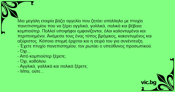 Μια μεγάλη εταιρία βάζει αγγελία που ζητάει υπάλληλο με πτυχίο πανεπιστημίου που να ξέρει αγγλικά, γαλλικά, ιταλικά και βέβαια κομπιούτερ. Πολλοί υποψήφοι εμφανίζονται, όλοι καλοντυμένοι και περιποιημένοι. Ανάμεσα τους ένας τύπος βρόμικος, κακοντυμένος και αξύριστος. Κάποια στιγμή έρχεται και η σειρά του για συνέντευξη.
