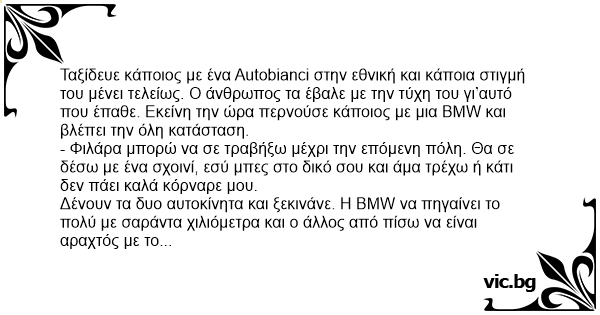 Ταξίδευε κάποιος με ένα Autobianci στην εθνική και κάποια στιγμή του μένει τελείως. Ο άνθρωπος τα έβαλε με την τύχη του γιαυτό που έπαθε. Εκείνη την ώρα περνούσε κάποιος με μια BMW και βλέπει την όλη κατάσταση.