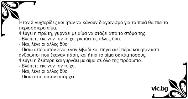 Ήταν 3 νυχτερίδες και ήταν να κάνουν διαγωνισμό για το ποιά θα πιει το περισσότερο αίμα.