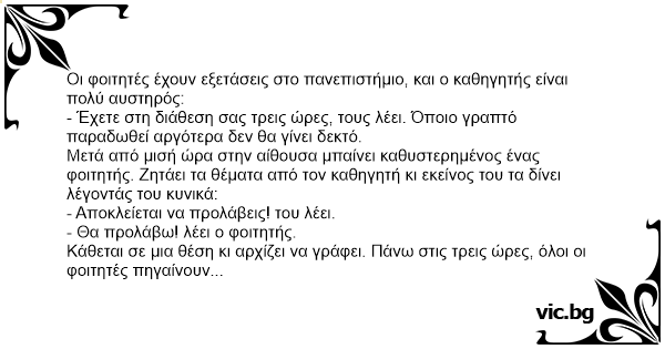Μετά από μισή ώρα στην αίθουσα μπαίνει καθυστερημένος ένας φοιτητής. Ζητάει τα θέματα από τον καθηγητή κι εκείνος του τα δίνει λέγοντάς του κυνικά: