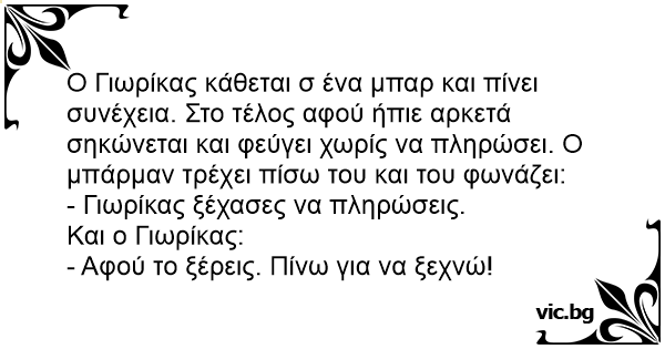 Ο Γιωρίκας κάθεται σ ένα μπαρ και πίνει συνέχεια. Στο τέλος αφού ήπιε αρκετά σηκώνεται και φεύγει χωρίς να πληρώσει. Ο μπάρμαν τρέχει πίσω του και του φωνάζει: