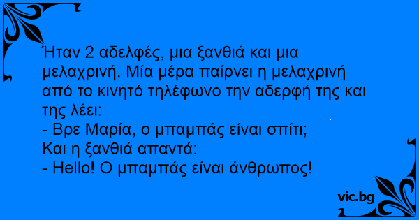 Ήταν 2 αδελφές, μια ξανθιά και μια μελαχρινή. Μία μέρα παίρνει η μελαχρινή από το κινητό τηλέφωνο την αδερφή της και της λέει:<br />- Βρε Μαρία, ο μπαμπάς είναι σπίτι;<br />Και η ξανθιά απαντά:<br />- Hello! Ο μπαμπάς είναι άνθρωπος!