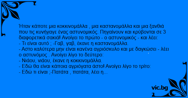 Ήταν κάποτε μια κοκκινομάλλα , μια καστανομάλλα και μια ξανθιά που τις κυνήγαγε ένας αστυνομικός. Πηγαίνουν και κρύβονται σε 3 διαφορετικά σακιά! Ανοίγει το πρώτο - ο αστυνομικός - και λέει: