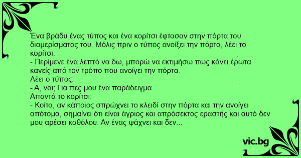 - Κοίτα, αν κάποιος σπρώχνει το κλειδί στην πόρτα και την ανοίγει απότομα, σημαίνει ότι είναι άγριος και απρόσεκτος εραστής και αυτό δεν μου αρέσει καθόλου. Αν ένας ψάχνει και δεν μπορεί να βρει την κλειδαρότρυπα σημαίνει ότι είναι πρωτάρης και ούτε αυτό μου αρέσει. Λοιπόν εσύ πως ξεκλειδώνεις την πόρτα;