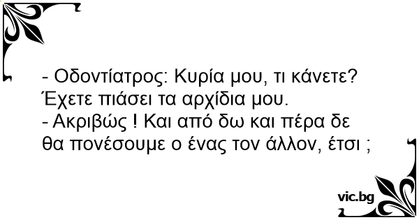 Σφράγισμα... Στον οδοντίατρο Зъболекар вади зъб на притеснен мъж. – Търся зъболекар, на който да имам пълно доверие! К зубному врачу на прием приходит женщина. Садится в кресло, открывает рот. Una mujer va al dentista. Cuando el médico se inclina para comenzar a trabajar, ella le agarra los testículos. El dentista dice: - Señora, creo que me está tocando mis partes nobles. La mujer contesta: - Sí, así que vamos a tener cuidado para no lastimarnos el uno al otro, ¿ok?. Der junge Zahnarzt hat seine Praxis neu eröffnet und seine allererste Patientin ist eine äußerst gutaussehende Blondine. Kaum hat er gesagt "Jetzt machen Sie mal den Mund auf", da spürt er wie ihre Hand sein Knie streichelt, dann seinen Oberschenkel rauffährt, seinen (mittlerweile) strammen Max... Докторът поглежда в устата му и казва: - Този зъб е в тежко състояние и трябва веднага да се извади. След тези думи зъболекарят се пресяга за клещите. Пациентът протяга ръка и стиска леко топките на зъболекаря с думите: - Няма да ни боли, нали, докторе? C'est une femme qui va chez le dentiste. Au moment où le dentiste s'approche du fauteuil pour commencer son travail, elle lui attrape les testicules au travers de ses vêtements! Le dentiste lui... Een vrouw gaat naar de tandarts en weet dat een kies gevuld moet worden. Op het moment dat de tandarts, met de boor in de hand, zich voorover buigt grijpt de vrouw hem in zijn kruis. Ze zegt: "We... Egy nő elmegy a fogorvoshoz. Amikor beül a székbe, megmarkolja a doki férfiasságát. - De hölgyem, ön a nemi szervemet fogja! - Így van, és most mindketten nagyon óvatosak leszünk, hogy ne okozzunk... Tandlægeskræk En ung kvinde skulle have trukket en tand ud, og tandlægen sagde som tandlæger nu engang altid siger, at det ikke ville komme til at gøre spor ondt. Han lænede sig ind over pigen, men...