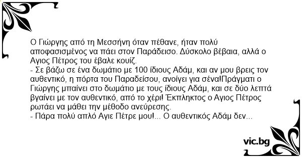 - Σε βάζω σε ένα δωμάτιο με 100 ίδιους Αδάμ, και αν μου βρεις τον αυθεντικό, η πόρτα του Παραδείσου, ανοίγει για σένα!Πράγματι ο Γιώργης μπαίνει στο δωμάτιο με τους ίδιους Αδάμ, και σε δύο λεπτά βγαίνει με τον αυθεντικό, από το χέρι! Έκπληκτος ο Aγιος Πέτρος ρωτάει να μάθει την μέθοδο ανεύρεσης.