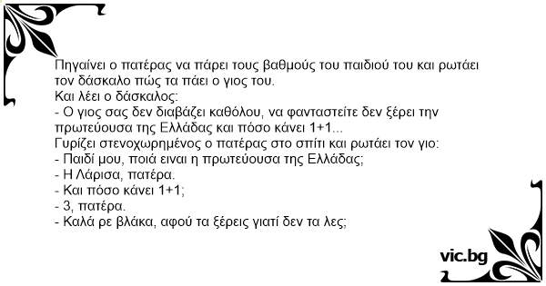 Πηγαίνει ο πατέρας να πάρει τους βαθμούς του παιδιού του και ρωτάει τον δάσκαλο πώς τα πάει ο γιος του.