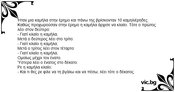 Ήταν μια καμήλα στην έρημο και πάνω της βρίσκονταν 10 καμηλιέρηδες. Καθώς προχωρούσαν στην έρημο η καμήλα άρχισε να κλαίει. Τότε ο πρώτος λέει στον δεύτερο: