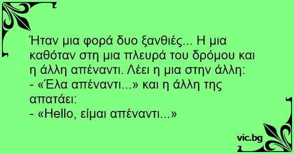 Ήταν μια φορά δυο ξανθιές... Η μια καθόταν στη μια πλευρά του δρόμου και η άλλη απέναντι. Λέει η μια στην άλλη: