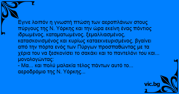 Εγινε λοιπόν η γνωστή πτώση των αεροπλάνων στους πύργους της Ν. Υόρκης και την ώρα εκείνη ένας πόντιος ιδρωμένος, καταματωμένος, ξεμαλλιασμένος, κατασκονισμένος και κυρίως καταεκνευρισμένος, βγαίνει από την πόρτα ενός των Πύργων προσπαθώντας με τα χέρια του να ξεσκονίσει το σακάκι και το παντελόνι του και... μονολογώντας: