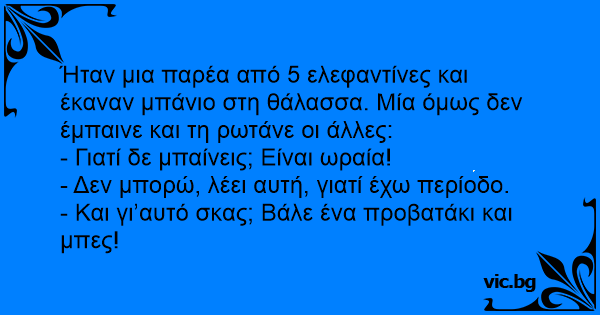 Ήταν μια παρέα από 5 ελεφαντίνες και έκαναν μπάνιο στη θάλασσα. Μία όμως δεν έμπαινε και τη ρωτάνε οι άλλες: