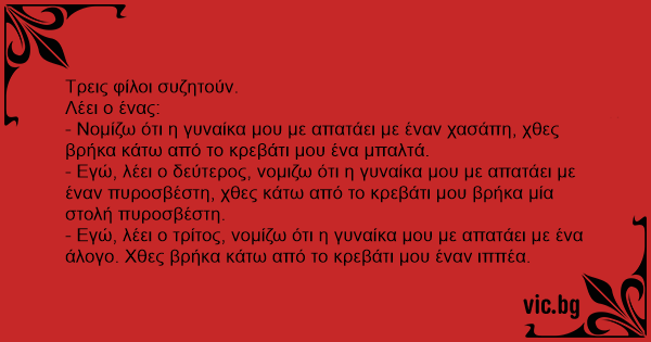 - Εγώ, λέει ο τρίτος, νομίζω ότι η γυναίκα μου με απατάει με ένα άλογο. Χθες βρήκα κάτω από το κρεβάτι μου έναν ιππέα.