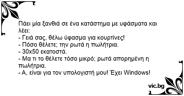 Πάει μία ξανθιά σε ένα κατάστημα με υφάσματα και λέει: - Γειά σας, θέλω ύφασμα για κουρτίνες! - Πόσο θέλετε; την ρωτά η πωλήτρια. - 30x50 εκατοστά. - Μα τι το θέλετε τόσο μικρό; ρωτά απορημένη η πωλήτρια. - Α, είναι για τον υπολογιστή μου! Έχει Windows!