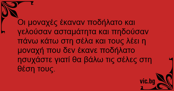 Οι μοναχές έκαναν ποδήλατο και γελούσαν ασταμάτητα και πηδούσαν πάνω κάτω στη σέλα και τους λέει η μοναχή που δεν έκανε ποδήλατο ησυχάστε γιατί θα βάλω τις σέλες στη θέση τους.