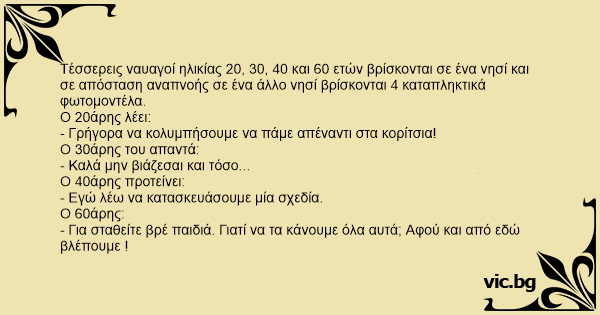 Τέσσερεις ναυαγοί ηλικίας 20, 30, 40 και 60 ετών βρίσκονται σε ένα νησί και σε απόσταση αναπνοής σε ένα άλλο νησί βρίσκονται 4 καταπληκτικά φωτομοντέλα.