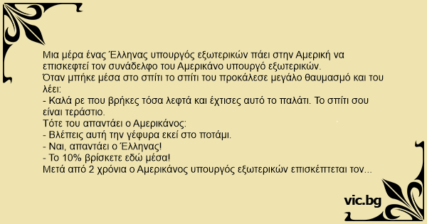 Μια μέρα ένας Έλληνας υπουργός εξωτερικών πάει στην Αμερική να επισκεφτεί τον συνάδελφο του Αμερικάνο υπουργό εξωτερικών.