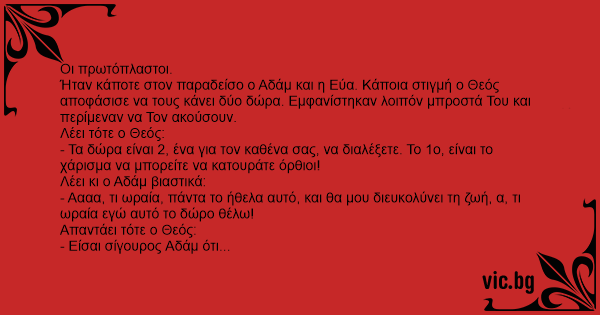 Ήταν κάποτε στον παραδείσο ο Αδάμ και η Εύα. Κάποια στιγμή ο Θεός αποφάσισε να τους κάνει δύο δώρα. Εμφανίστηκαν λοιπόν μπροστά Του και περίμεναν να Τον ακούσουν.