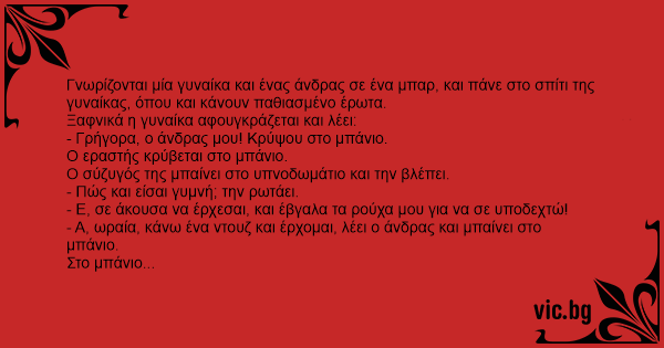 - Α, ωραία, κάνω ένα ντουζ και έρχομαι, λέει ο άνδρας και μπαίνει στο μπάνιο.
