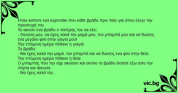 - Θεούλη μου, να έχεις καλά την μαμά μου, τον μπαμπά μου και να δώσεις ενα μεγάλο φιλί στην γιαγιά μου!