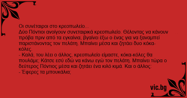 - Καλά, του λέει ο άλλος, κρεοπωλείο είμαστε, κόκα-κόλες θα πουλάμε; Κάτσε εσύ εδώ να κάνω εγώ τον πελάτη. Μπαίνει τώρα ο δεύτερος Πόντιος μέσα και ζητάει ένα κιλό κιμά. Και ο άλλος: