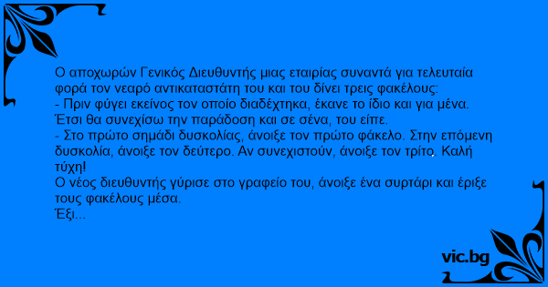 Ο αποχωρών Γενικός Διευθυντής μιας εταιρίας συναντά για τελευταία φορά τον νεαρό αντικαταστάτη του και του δίνει τρεις φακέλους: