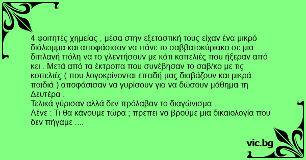Πήγαν στον καθηγητή που το διδάσκει λοιπόν , του εξήγησαν ότι και αυτοί σαν φοιτητές είχαν βγει να ξεσκάσουν λιγάκι και τελικά στον γυρισμό τους έπιασε λάστιχο και δεν πρόλαβαν να πάνε να δώσουν . Ο καθηγητής δέχτηκε να τους βάλει να δώσουν την επόμενη μέρα μόνους τους ...