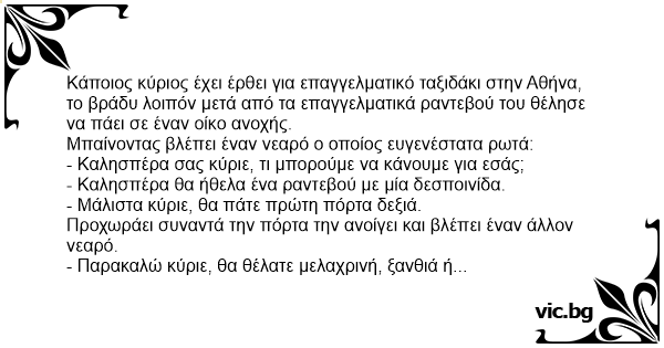 Kάποιος κύριος έχει έρθει για επαγγελματικό ταξιδάκι στην Aθήνα, το βράδυ λοιπόν μετά από τα επαγγελματικά ραντεβού του θέλησε να πάει σε έναν οίκο ανοχής.