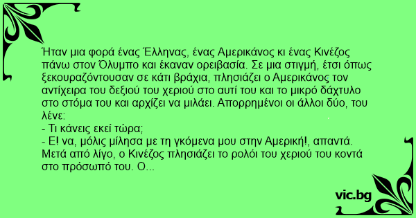 Ήταν μια φορά ένας Έλληνας, ένας Αμερικάνος κι ένας Κινέζος πάνω στον Όλυμπο και έκαναν ορειβασία. Σε μια στιγμή, έτσι όπως ξεκουραζόντουσαν σε κάτι βράχια, πλησιάζει ο Αμερικάνος τον αντίχειρα του δεξιού του χεριού στο αυτί του και το μικρό δάχτυλο στο στόμα του και αρχίζει να μιλάει. Απορρημένοι οι άλλοι δύο, του λένε: